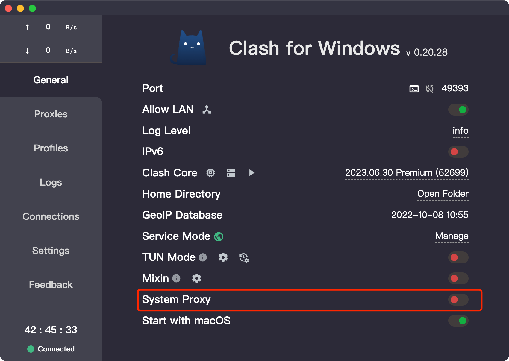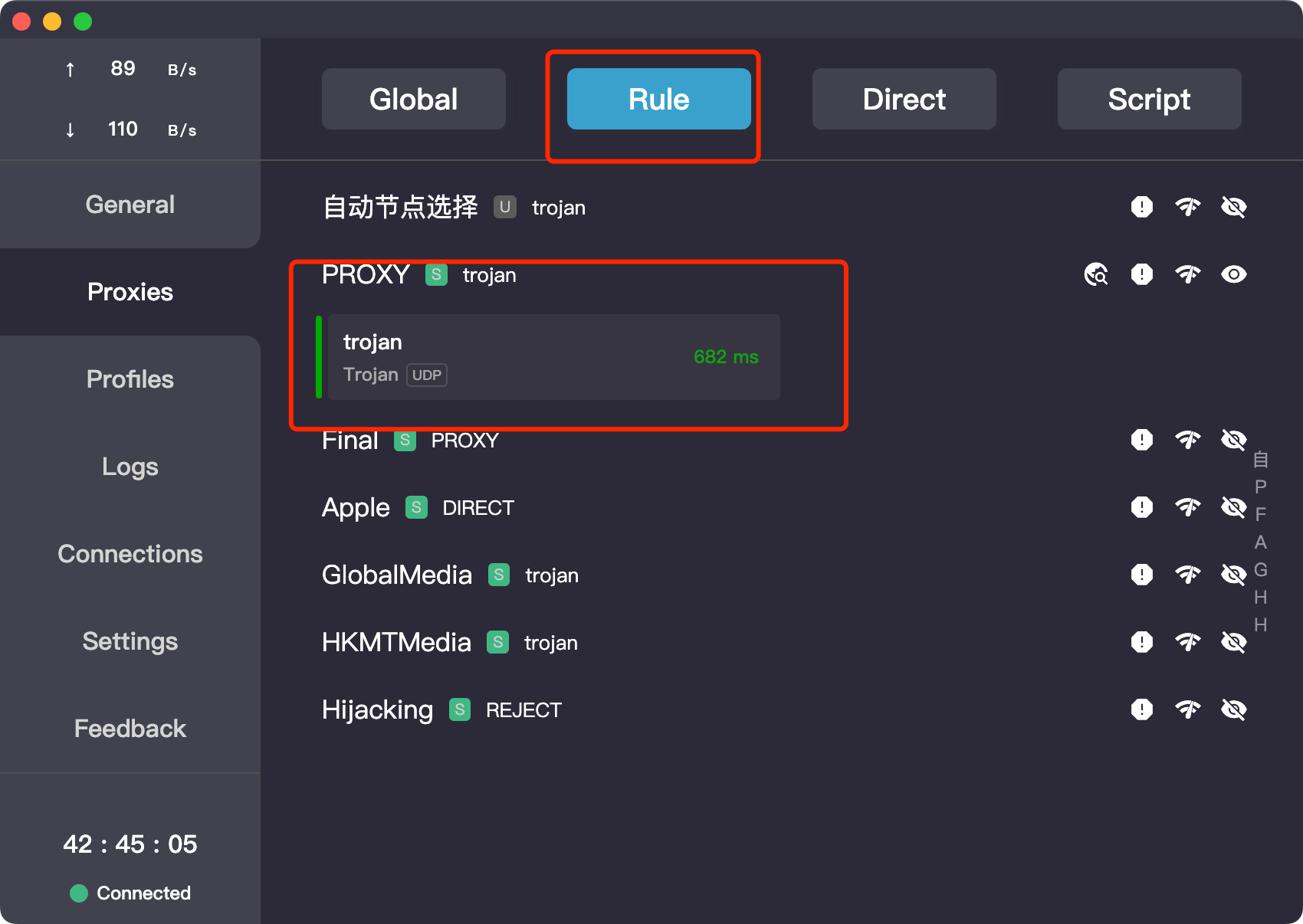 Mac使用指南 发表于 2023-07-20 下载clash点击下载 复制给你发的链接,粘贴到profiles页面的url里,再点download 在proxies页面选择节点 在general页面打开system proxy开关 上谷歌测试(https://www.google.com)以后连不上直接点profiles页面里trojan.yml旁边的刷新按钮即可 -------------已经到底啦!-------------